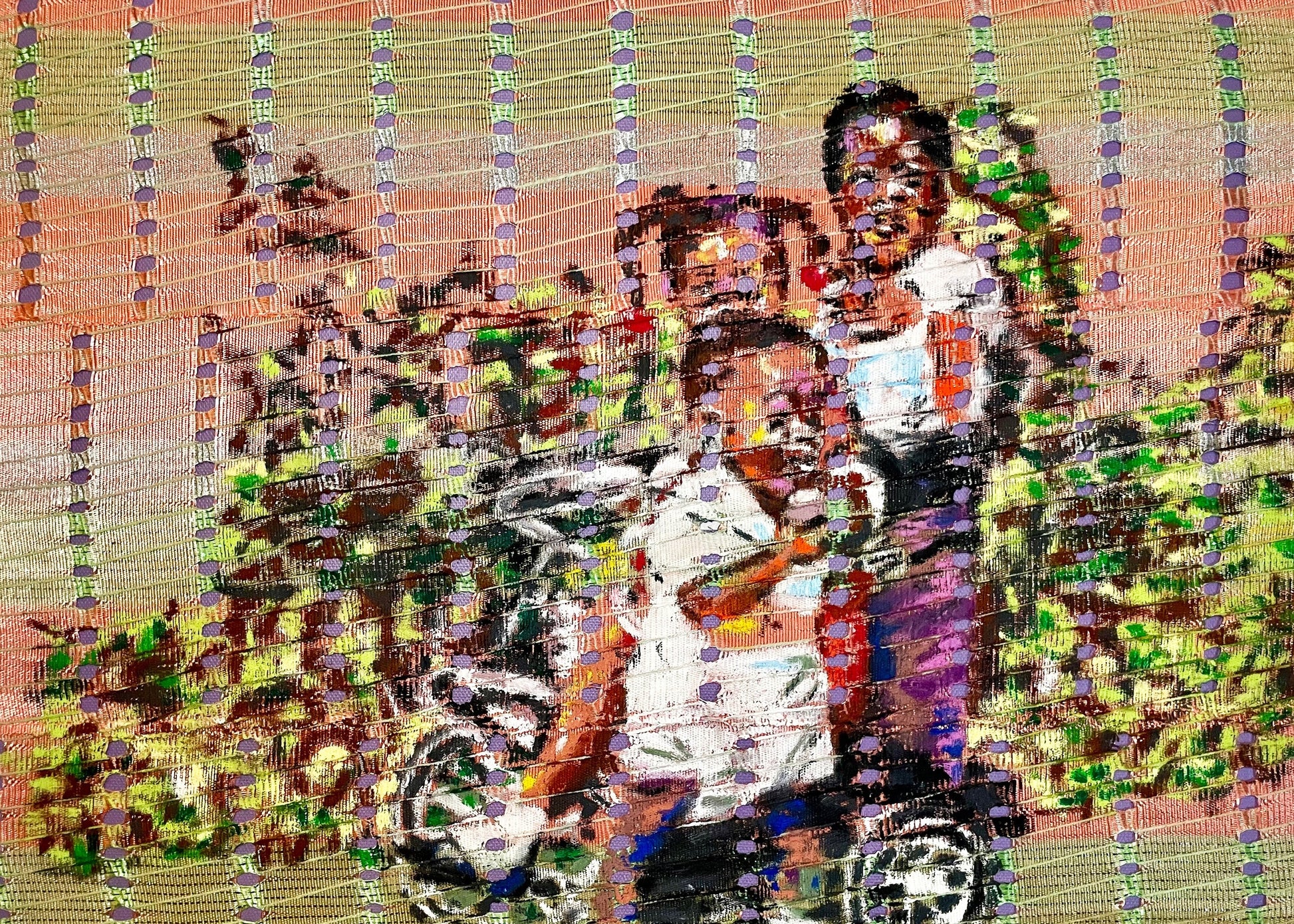 "Our First Ride" is part of the 'Threads of Kinship' series, which explores sibling bonds through familial relationships. Inspired by vintage West African family photographs, the artwork evokes the innocence and joy of childhood. This piece reflects the importance of nurturing familial ties, which serve as the foundation for communities and future generations. It invites viewers to reflect on the universal themes of love, support, and unity that connect us all in the grand tapestry of life.